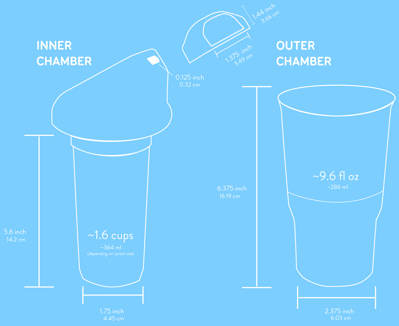 This pack comes with 2 of our best-selling CrunchCup combinations. This makes for an ideal buy, whether you prefer to snack alone or share with a friend. Say goodbye to soggy cereal, The CrunchCup® keeps your cereal crunchy. Simply add cereal to the inner cup, milk into the outer cup, screw on the lid, and you're ready to crunch. The milk and cereal don't meet until it's time to eat.