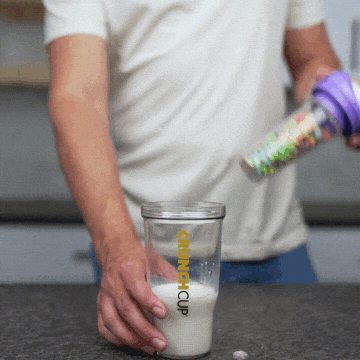A: The CrunchCup® holds just under 2 servings of your favorite cereal and milk portions, allowing you to have cereal twice a day or share it with a friend.